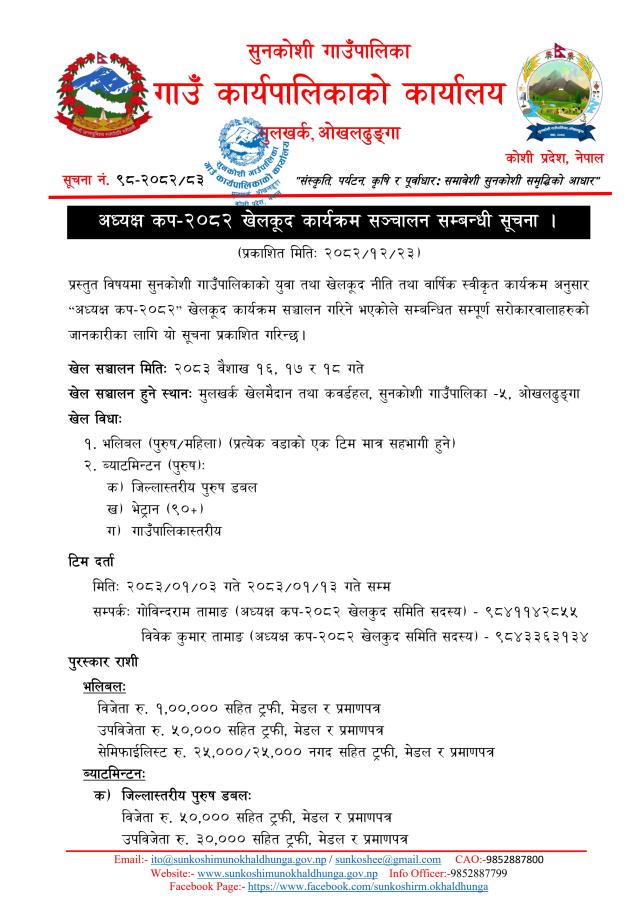 अध्यक्ष कप-२०८२ खेलकूद कार्यक्रम सञ्‍चालन सम्बन्धी सूचना।