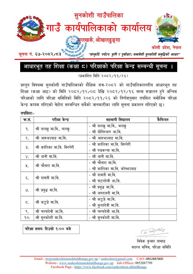 आधारभूत तह शिक्षा (कक्षा ८) परिक्षाको परिक्षा केन्द्र सम्बन्धी सूचना ।