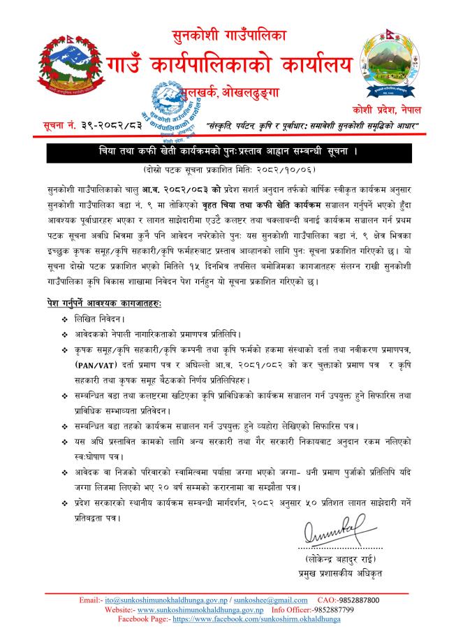 चिया तथा कफी खेती कार्यक्रमको पुनः प्रस्ताव आह्वान सम्बन्धी सूचना ।