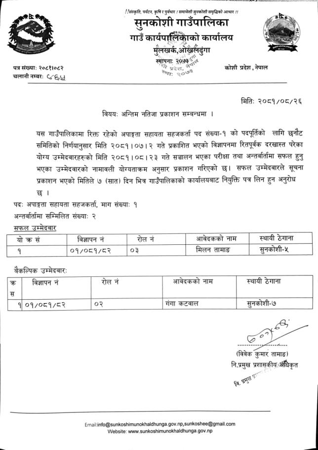 अन्तिम नतिजा प्रकाशन गरिएको सम्बन्धमा।