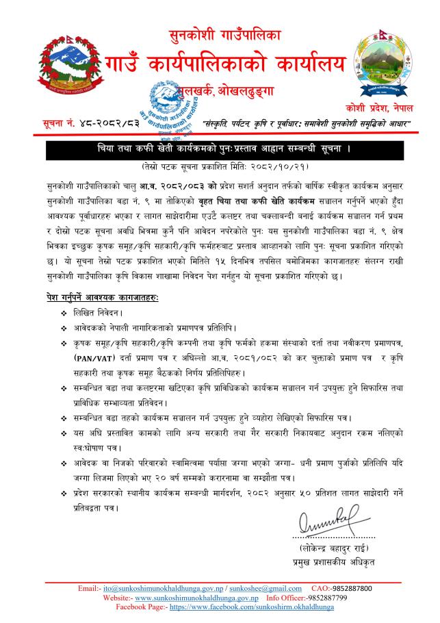 चिया तथा कफी खेती कार्यक्रमको पुनः प्रस्ताव आह्वान सम्बन्धी सूचना।