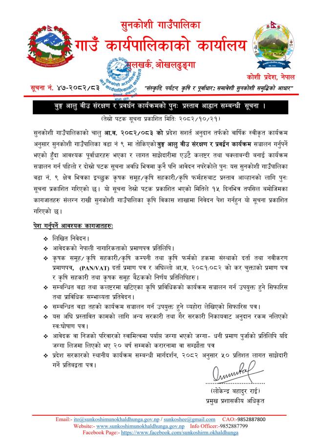 बुङ्ग आलु वीउ संरक्षण र प्रवर्धन कार्यक्रमको पुनः प्रस्ताव आह्वान सम्बन्धी सूचना।
