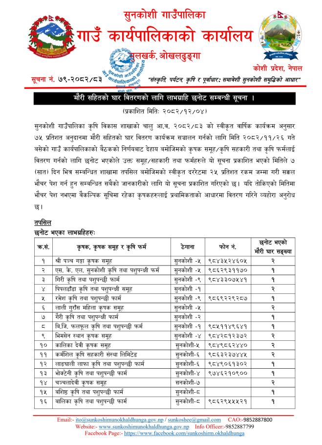 मौरी सहितको घार वितरणको लागि लाभग्राहि छनोट सम्बन्धी सूचना।