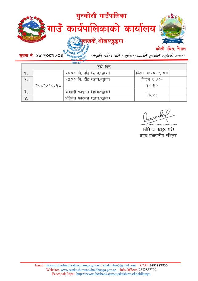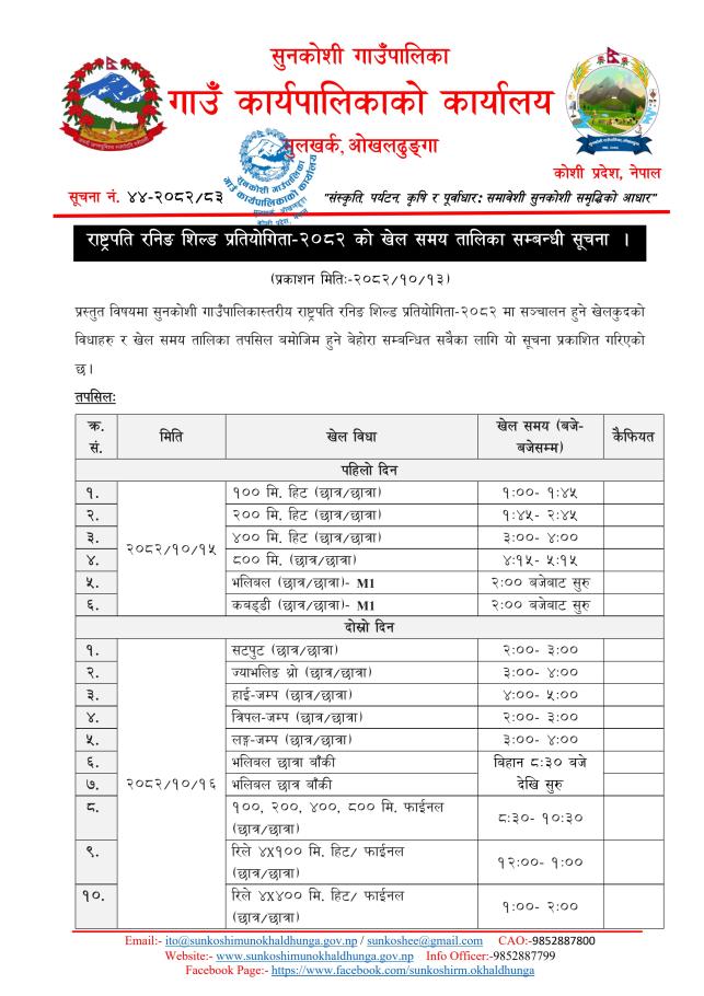 राष्ट्रपति रनिङ शिल्ड प्रतियोगिता-२०८२ को खेल समय तालिका सम्बन्धी सूचना ।