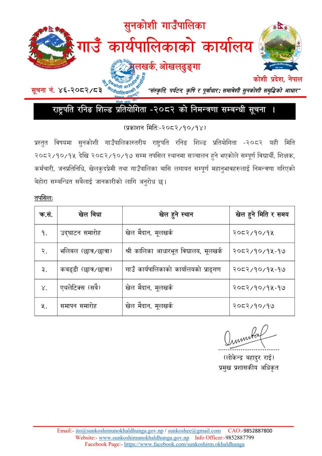 राष्ट्रपति रनिङ शिल्ड प्रतियोगिता -२०८२ को निमन्त्रणा सम्बन्धी सूचना ।