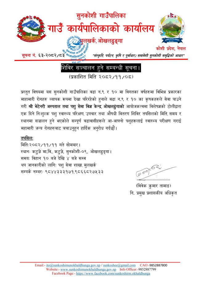 शिविर सञ्चालन हुने सम्बन्धी सूचना ।