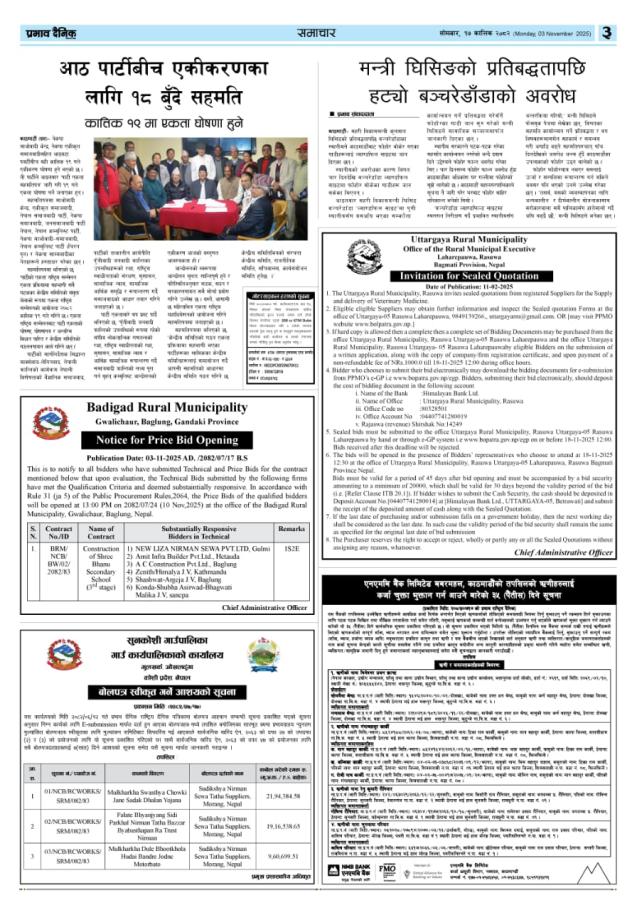 बोलपत्र स्वीकृत गर्ने आशयको सूचना।